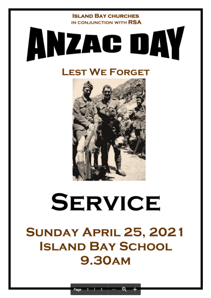 Island Bay churches, in conjunction with the RSA, are holding an ANZAC Day service Sunday April 25, 2021 at Island Bay School at 9.30am.