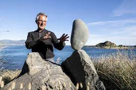 Stavros Kyriakides, a self-taught environmental artist, creates delicately balanced rock and driftwood sculptures along Wellington’s south coast, complementing the area’s rugged natural beauty in subtle ways.