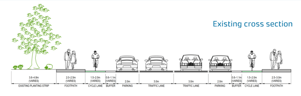 The approved road layout puts people on bikes in between a concrete kerb, and (in many cases) either a concrete or mountable separator. Although the goal of the approved design is to improve safety for all road users, we understand how adding a concrete/mountable separator can appear counterintuitive to this goal. Over the years, the leading cause of reported crashes on The Parade (where bikes are involved) are due to motor vehicles driving into and out of driveways, and in intersections where vehicles and bikes are more likely to come into contact with each other. In these crashes, drivers often failed to see the cyclist on the bike lane when turning into/out of driveways, parking spaces, or intersections. There have also been reports of bikes having to go around vehicles that park on the bike lane, or dodge car doors that swing open into the bike lanes.