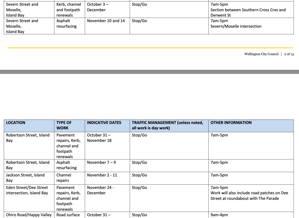 Note that the information in the document does not include work for other organisations working in the road corridor such as Waka Kotahi, Wellington Water, Wellington Electricity or building works which require access to the road or footpath.
