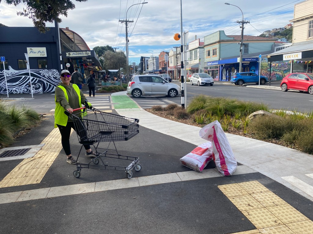 The turnout was, well, limited! Wayne and I made our way up to the Village and back. We collected 3 bags of rubbish, a blue tub, and a rotten picture board. We returned a trolley to New World from down near the Bowling club.
