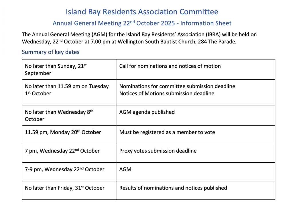 The Annual General Meeting (AGM) for the Island Bay Residents’ Association (IBRA) will be held on Wednesday, 22nd October at 7.00 pm at Wellington South Baptist Church, 284 The Parade.